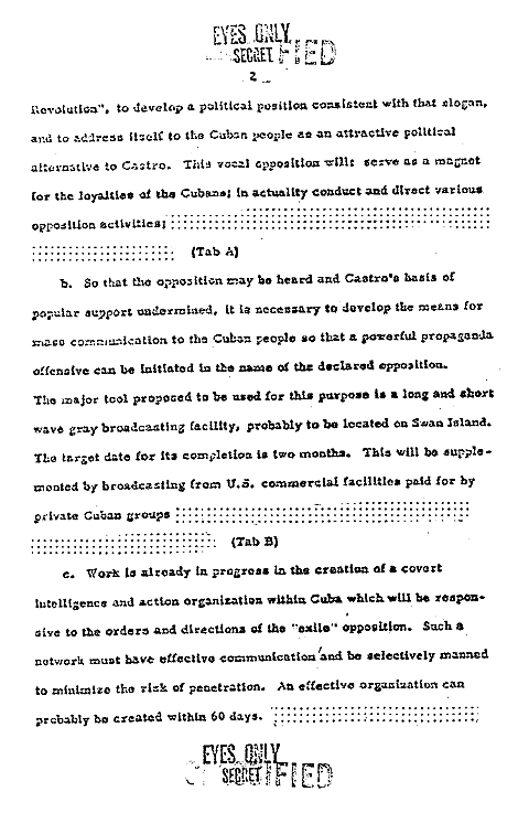 This once-secret CIA plan, "A Program of Covert Action Against the Castro Regime," details the measures President Eisenhower authorized in March, 1960, to undermine the Revolutionary government. The plan calls for the creation of exile political and paramilitary groups and anti-Castro radio broadcasts. Just over a year later, in April, 1961, the plan culminated in the Kennedy administration's worst foreign policy disaster, the Bay of Pigs invasion.